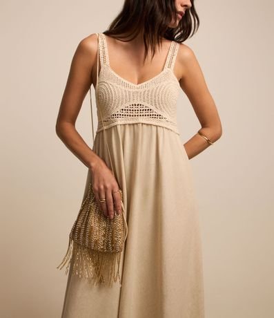 Vestido Evasê Midi em Viscolinho com Busto Efeito Crochê