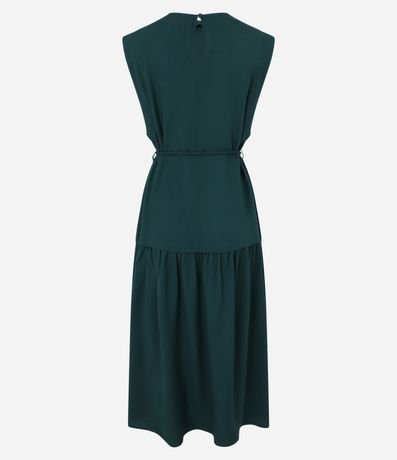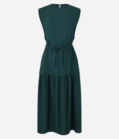 Ref: Vestido evasê de comprimento midi, confeccionado em viscolinho com viscose mais sustentável e 19% de linho, com gola redonda por fechamento por gota nas costas. Peça tem cinto de corda para amarração na cintura e barra com recorte franzido, além de caimento pesado.