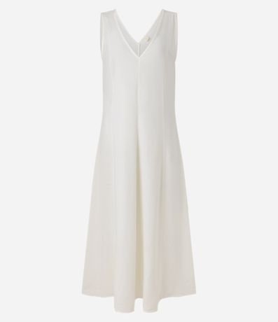 Vestido evasê midi, sem mangas, confeccionado em viscolinho com 30% de linho, com decote V no busto e nas costas e pences verticais. Este produto possui viscose certificado em sua composição, além de ter sido produzido através de processos mais sustentáveis, sendo ambientalmente mais responsável.
