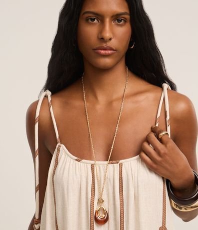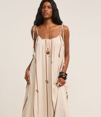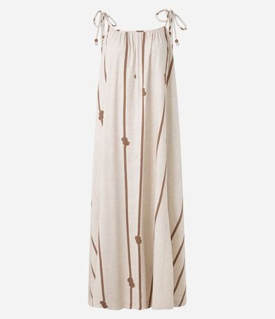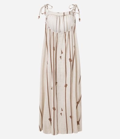 Vestido evasê midi e sem mangas, confeccionado em viscolinho com 15% de linho, com decote redondo, alças finas com amarração, costas abertas e estampa de cordas com nós. Este produto possui viscose certificada em sua composição, sendo ambientalmente mais responsável.
