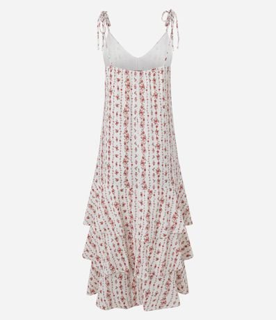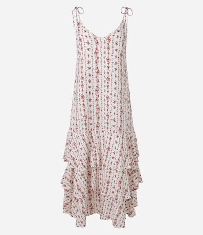 Vestido evasê midi, sem mangas, de alças finas, confeccionada em viscolinho, com decote V, barra franzida com grandes babados e estampa floral liberty. Este produto possui viscose certificada em sua composição, sendo ambientalmente mais responsável.