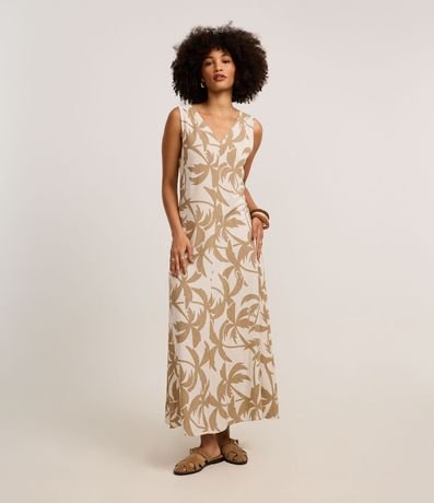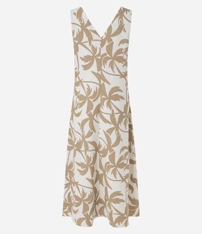Ref: Vestido evasê midi, sem mangas, confeccionado em viscolinho, com decote V e costas decotadas, com estamparia de folhagens. Este produto possui viscose certificada em sua composição, sendo ambientalmente mais responsável.