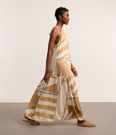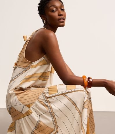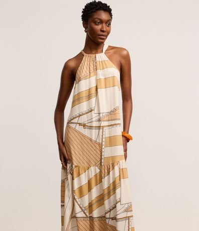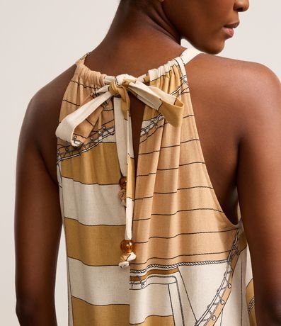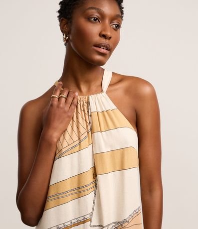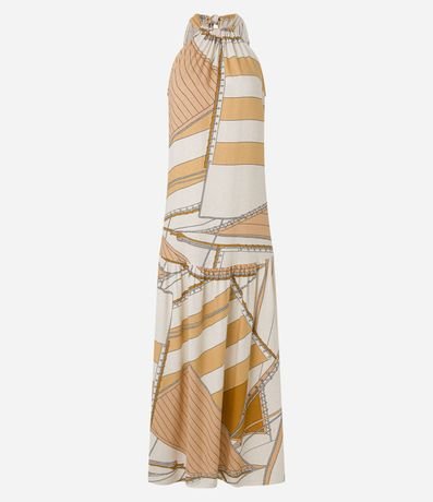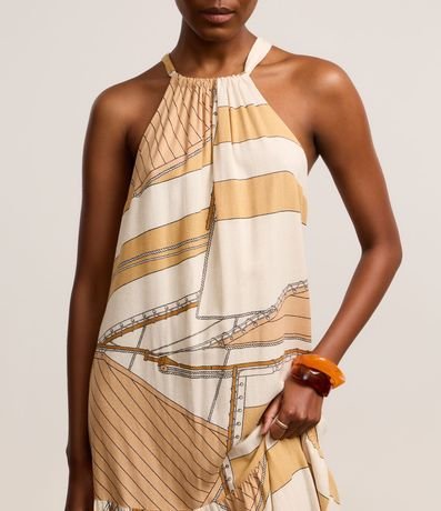 Ref: Vestido evasê midi e sem mangas, confeccionado em viscolinho, com gola halter com amarração e saia com recorte franzido. A peça tem estamparia náutica de vela de barco. Este produto possui viscose certificada em sua composição, além de ter sido produzido através de processos mais sustentáveis com boas práticas ambientais, sendo ambientalmente mais responsável.
