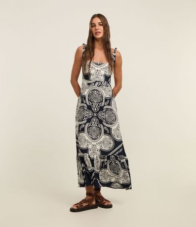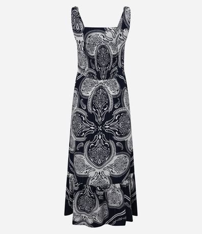 Ref: Vestido midi feminino, confeccionado em viscose mais sustentável, com decote reto, alças médias e estampa paisley.