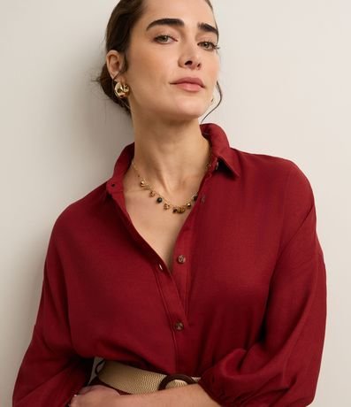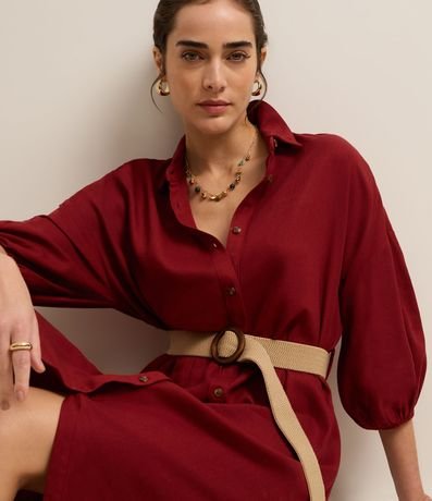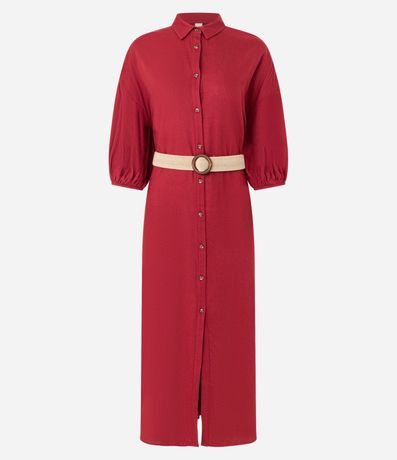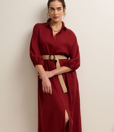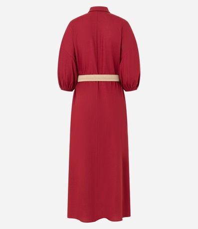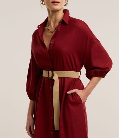 Vestido evasê longo, confeccionado em viscose, com colarinho na gola, abotoamento frontal e mangas curtas de cavas deslocadas com elástico. Inclui cinto de elástico com efeito de ráfia e com fivela redonda. Este produto possui viscose certificada em sua composição, sendo ambientalmente mais responsável.