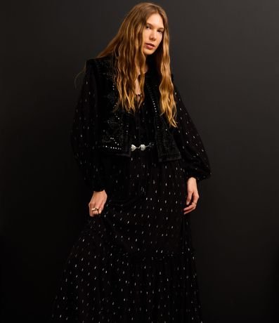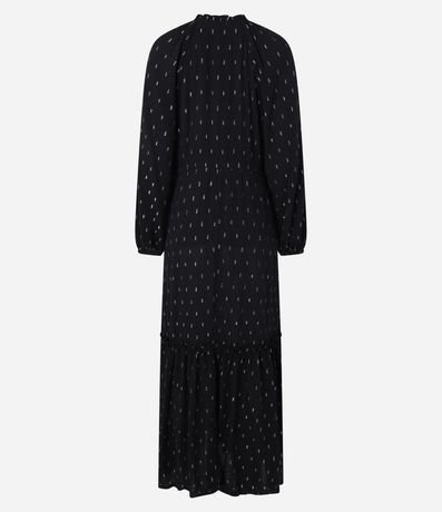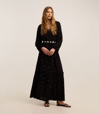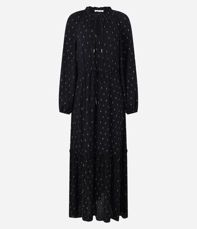 Ref: Vestido evasê midi de mangas longas, confeccionada em viscose, com gola V com amarrações com ponteiras metalizadas e ajuste na cintura. Peça tem recorte franzido na barra e detalhes contrastantes no tecido. Este produto possui viscose certificada em sua composição, sendo ambientalmente mais responsável.
