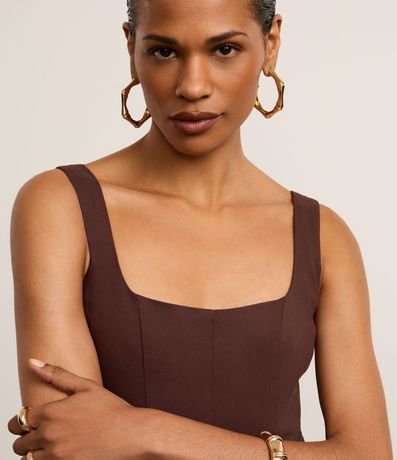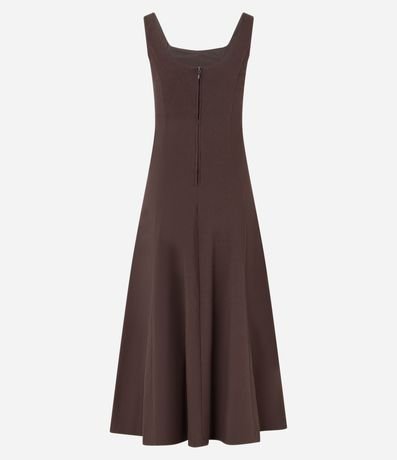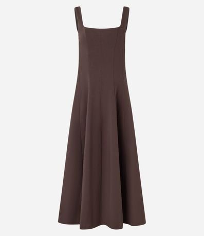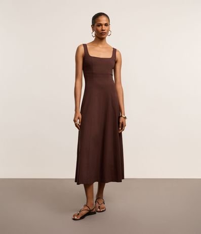 Ref: Vestido evasê midi e sem mangas, confeccionado em viscose, com alças médias, decote quadrado e recortes verticais. Este produto possui viscose certificada em sua composição, sendo ambientalmente mais responsável.
