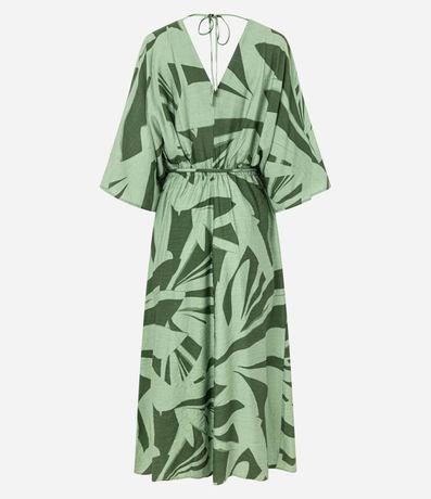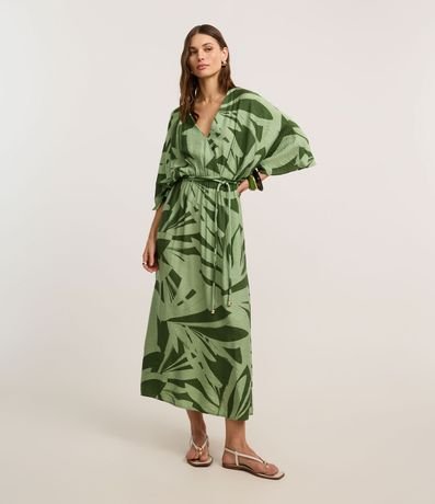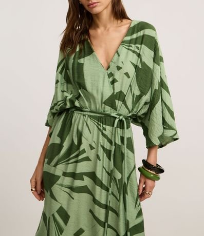 Ref: Vestido evasê midi de mangas amplas, confeccionado em viscose, com decote V, elástico e amarração na cintura e estampa de folhagens. Este produto possui material mais sustentável em sua composição, sendo ambientalmente mais responsável.