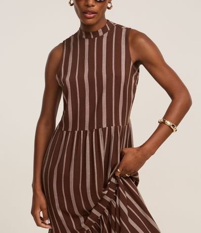 Ref: Vestido evasê midi e sem mangas, confeccionado em viscose, com golinha alta, recorte na cintura, recortes franzidos na saia e listras verticais desencontradas. Este produto possui viscose certificada em sua composição, sendo ambientalmente mais responsável.