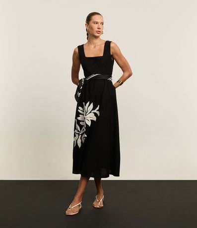 Ref: Vestido evasê midi, confeccionado em algodão com 13% de linho, com decote quadrado e sem mangas. A peça tem textura maquinetada, que confere um efeito de relevo sofisticação à peça. Conta também com bordado aplicado de folhagens na saia. Este produto possui algodão certificado BCI em sua composição, sendo ambientalmente mais responsável.