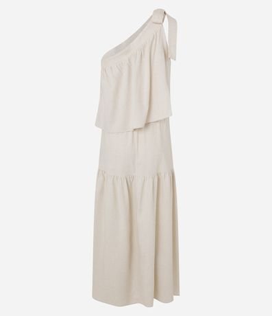 Ref: Vestido evasê midi, confeccionado em viscolinho com 30% de linho, com decote ombro único com laço no ombro, sobreposição no busto e recorte franzido na barra. Este produto possui viscose certificada em sua composição, além de ter sido produzido através de processos mais sustentáveis com boas práticas ambientais, sendo ambientalmente mais responsável.