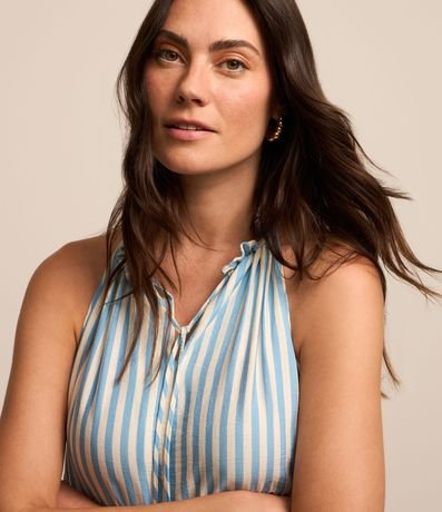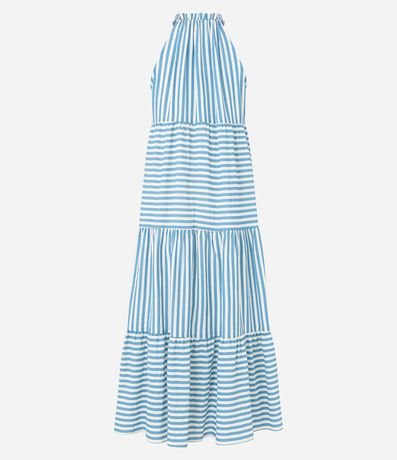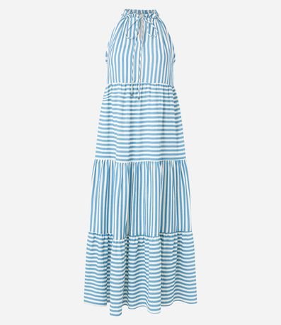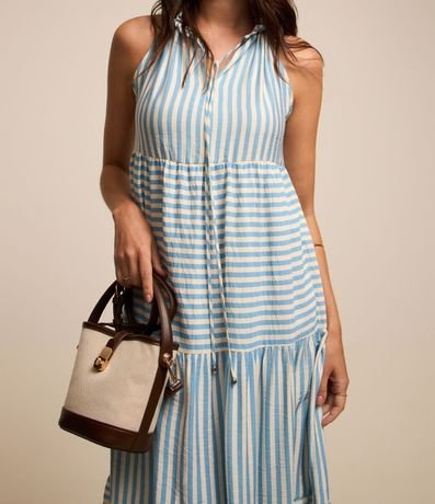 Vestido evasê new midi sem mangas confeccionado em viscose com gola com abertura vazada com amarração, recortes com listras em sentido alternado e barra franzida.