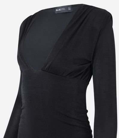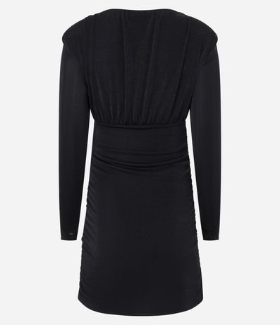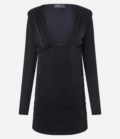 Vestido feminino curto, confeccionado em ribana brilhosa, com mangas longas e sem estampa. Possui textura franzida, decote quadrado profundo e diferencial de ombreiras.
