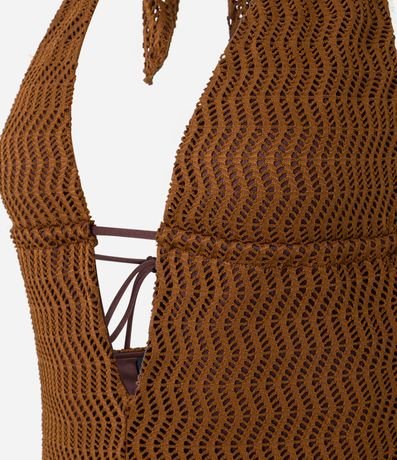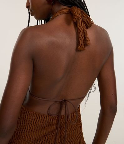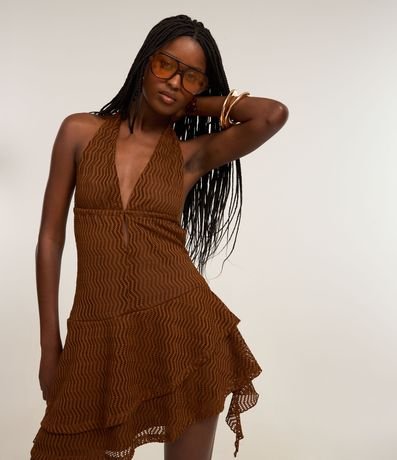 Vestidinho feminino confeccionado em cotton, com textura de furinhos, decote frente única e barra assimétrica com babados. Possui amarração nas costas e gola.