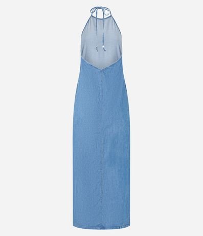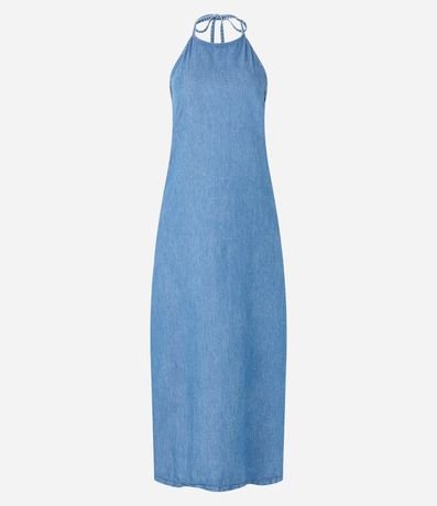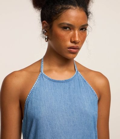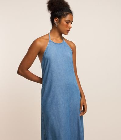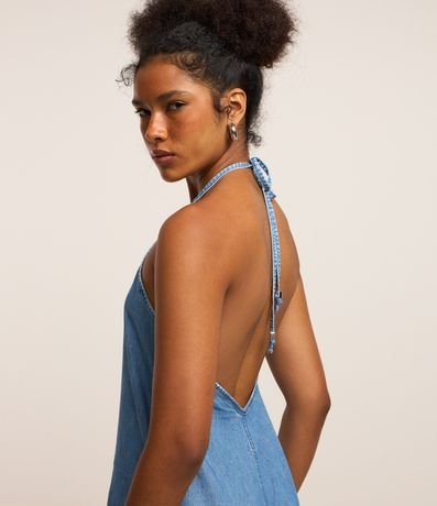Vestido feminino com decote frente única, costas abertas, confeccionado em jeans e com amarração no pescoço.
