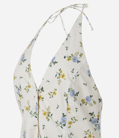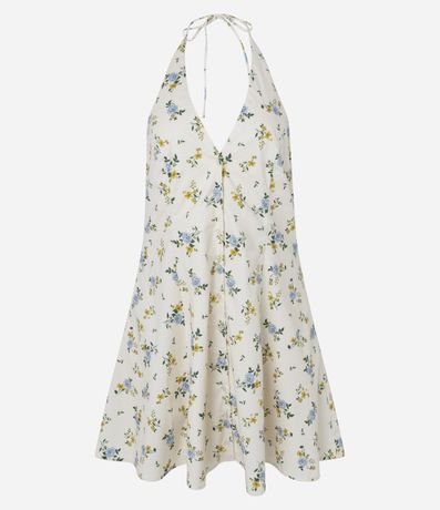 Ref: Vestido curto feminino confeccionado em algodão mais sustentável. Possui decote frente única em formato v, fechamento nas costas por amarração fina no pescoço, deixando as costas parcialmente abertas com um decote em u, fechamento frontal por pequenos botões e estampa floral delicada.