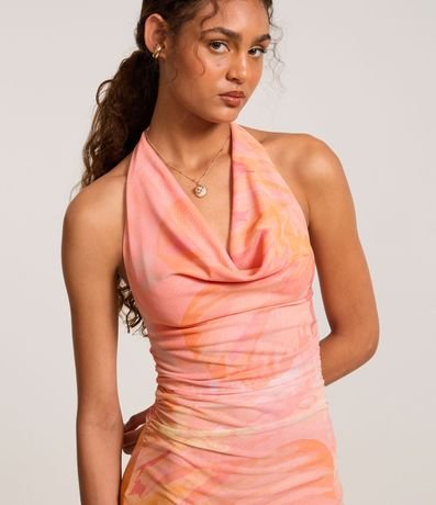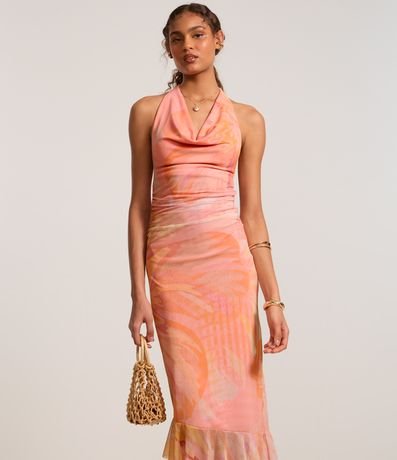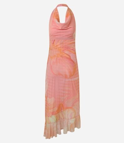 Ref: Vestido frente única confeccionado em malha de tule com estampa floral. A peça tem decote degagê, franzido lateral e babado maria assimétrico na barra.
