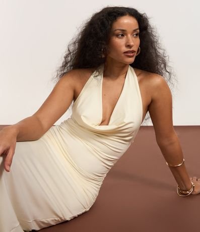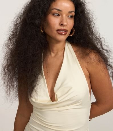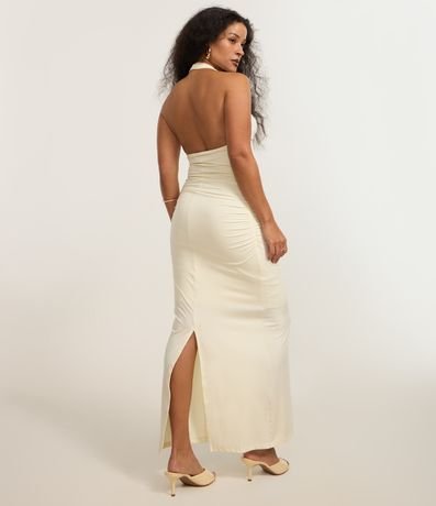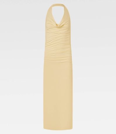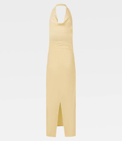 Vestido frente única e longo, confeccionado em microfibra com elastano, com decote franzido, costas abertas e fenda na barra. Este produto foi fabricado através de processos mais sustentáveis , sendo ambientalmente mais responsável .