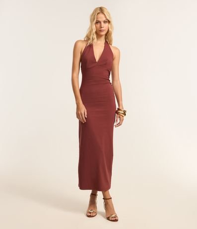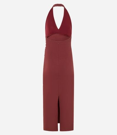 Vestido de frente única, ajustado,  new midi, confeccionado em bengaline, com franzidos e fenda na barra. Este produto possui viscose certificada em sua composição, sendo ambientalmente mais responsável.