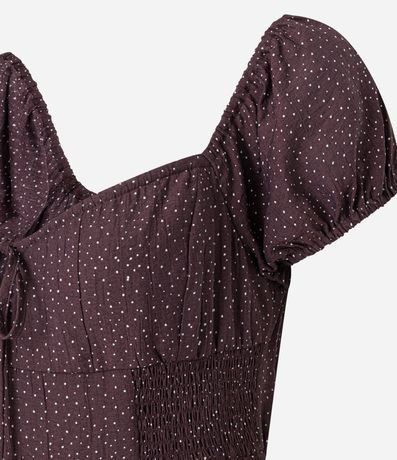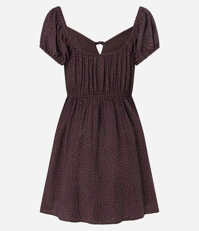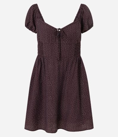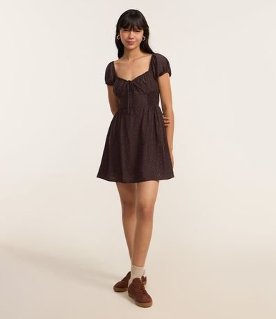 Ref: Vestidinho curto feminino confeccionado em viscose e poliamida, de modelo godê, com decote quadrado e mangas curtas bufantes. Possui amarração no busto, recorte na cintura, lastex nas costas e padronagem poá.
