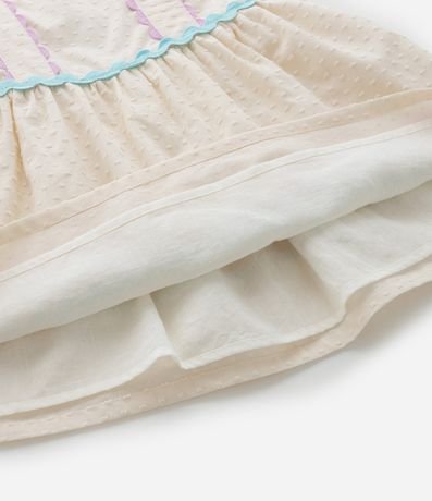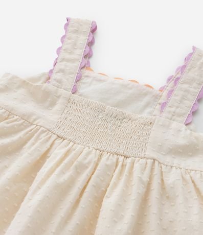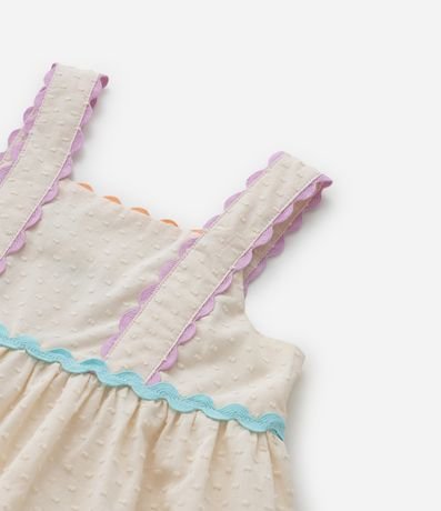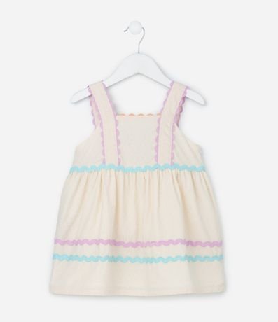 Ref: Vestido infantil confeccionado em tricoline mais sustentável, com decote reto, alças largas e aviamentos coloridos.