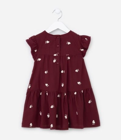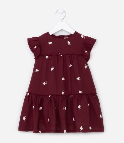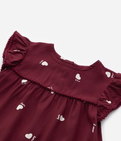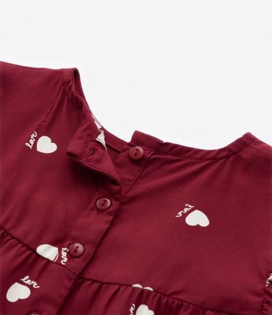 Ref: Vestido infantil confeccionado em viscose, com gola redonda, manga curta com babadinho, detalhes de pompons e estampa de mini corações. Possui fechamento por botões.