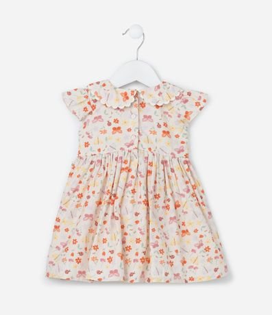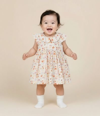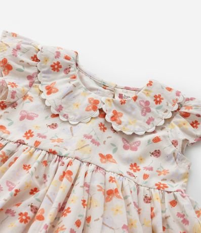 Ref: Vestidinho infantil com babadinho delicados na gola, mangas curtas, estampa floral e acompanha calcinha. O item é confeccionado com boas práticas ambientais e algodão certificado bci.