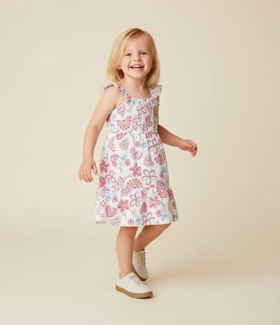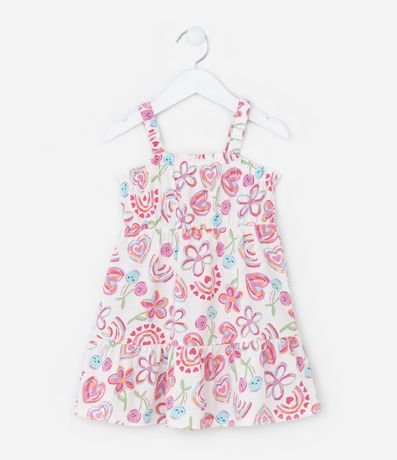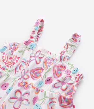 Ref: Vestido infantil confeccionado em algodão de material mais sustentável. Possui alças elásticas médias, decote com babadinho e estampa de flores e corações.