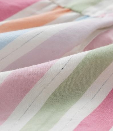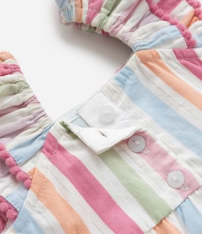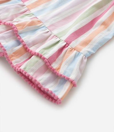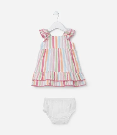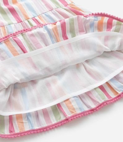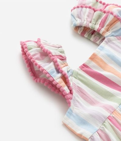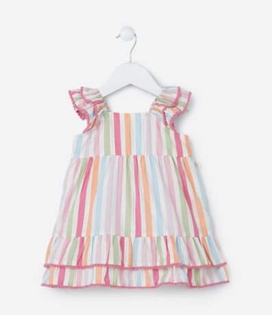 Ref: Vestidinho infantil confeccionado em tricoline, com babadinhos nas mangas e saia, pompons nas bordas e estampa listrada. Acompanha calcinha.