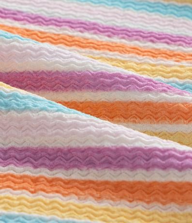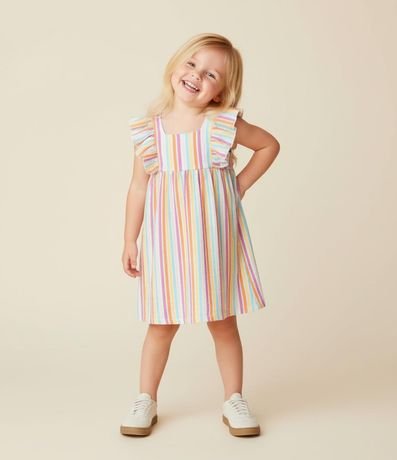 Vestido infantil confeccionado em crepe, com decote quadrado, mangas com babadinhos e estampa de listras.