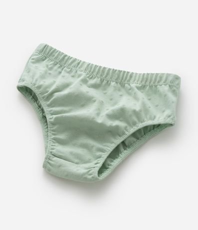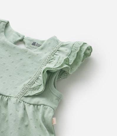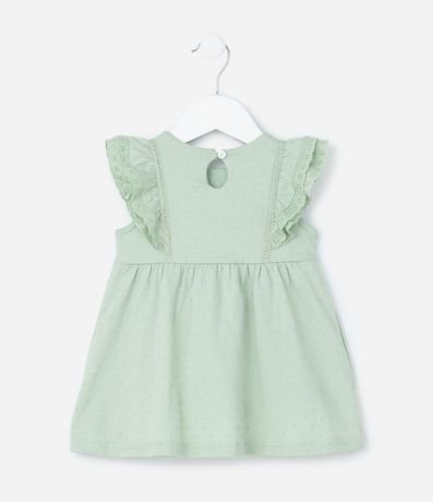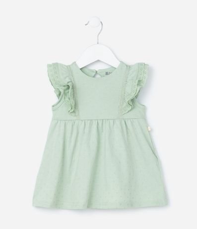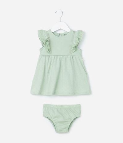 Ref: Vestidinho infantil para bebês com textura de bolinhas, sem mangas, com babadinhos delicados nas cavas e fechamento por gota. Acompanha calcinha. Peça confeccionada com algodão mais sustentável.