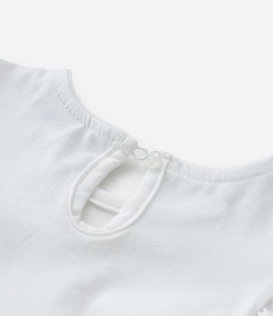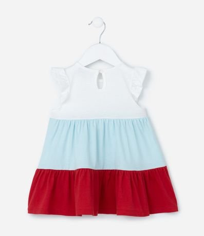 Vestidinho para bebês confeccionado em algodão mais sustentável. A peça não tem mangas, tem babados nos ombros, gola redonda, aplicação de topinho e babados tricolores na saia.