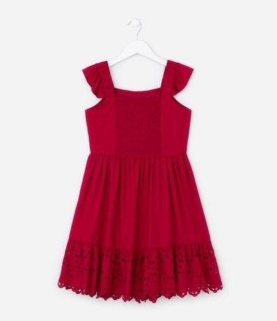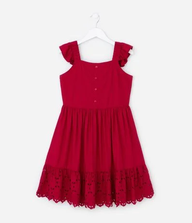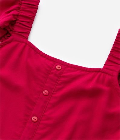 Ref: Vestidinho infantil confeccionado em tecido plano de viscose, com decote quadradinho e alças elásticas com babadinho. Sem estampa, possui detalhe de botões fakes no busco, recorte franzido na cintura, lastex nas costas e babado de broderie na barra.
