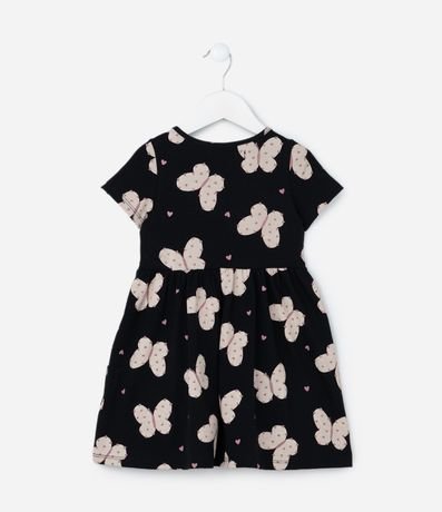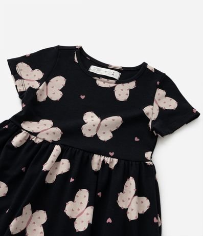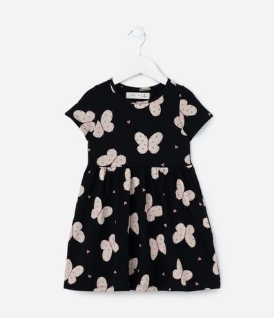 Ref: Vestido infantil confeccionado em algodão, com gola redonda, mangas curtas, preguinhas na cintura e estampa de borboletas.