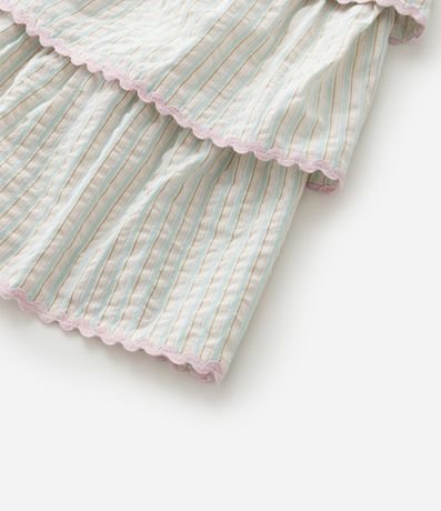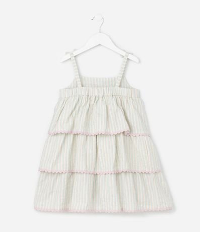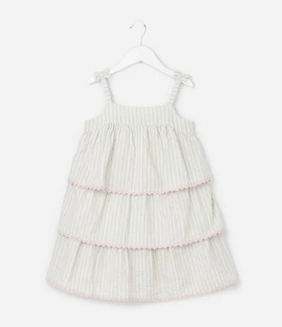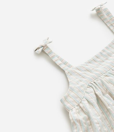 Vestidinho infantil confeccionado em tricoline mais sustentável. Possui decote quadrado, alças com lacinhos, babadinhos, estampa de listras e aplicação de sianinhas.