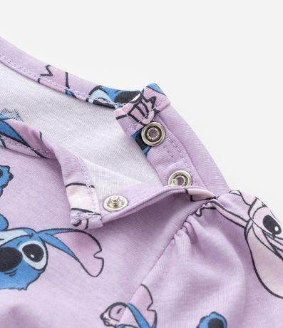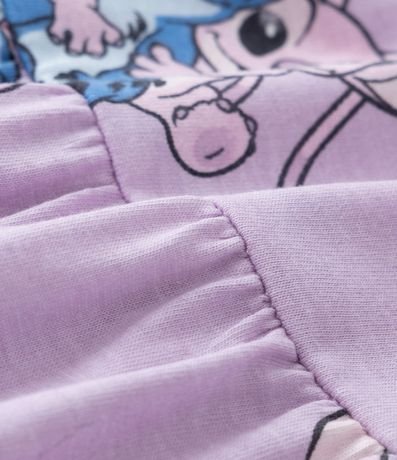 Vestidinho infantil confeccionado em algodão mais sustentável e com boas práticas ambientais. Possui gola redonda, manga curta e estampa do Stitch e Angel.