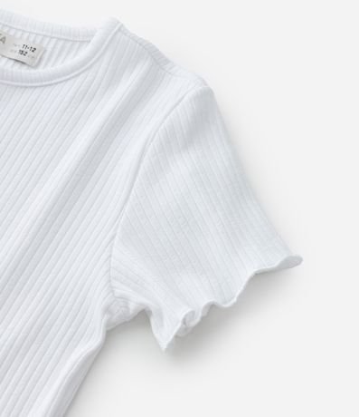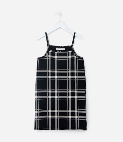 Vestido infantil com tiras finas, estampa xadrez e blusa canelada com manga curta.