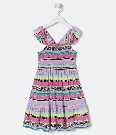 Ref: Vestido infantil, com babadinho nas alças, lastex no busto e estampa colorida e em repetição.
