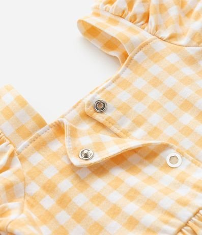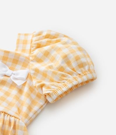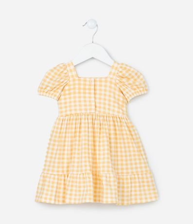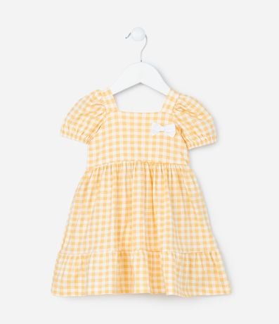 Ref: Vestido infantil menina confeccionado em algodão certificado bci em melhores práticas ambientais, decote quadrado com mangas curtas bufantes, lacinho aplicado contrastante, estampa xadrez e fechamento nas costas com botões de pressão, acompanhada por calcinha combinando com elástico no cós.
