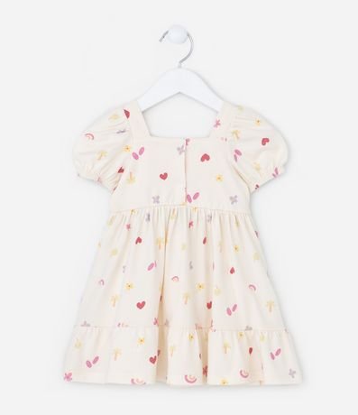 Ref: Vestido infantil confeccionado em algodão mais sustentável através de boas práticas ambientais. Possui decote quadrado, com lacinho aplicado, manga curta, com elástico, abotoamento traseiro, babadinho na barra e estampa de mini ícones.