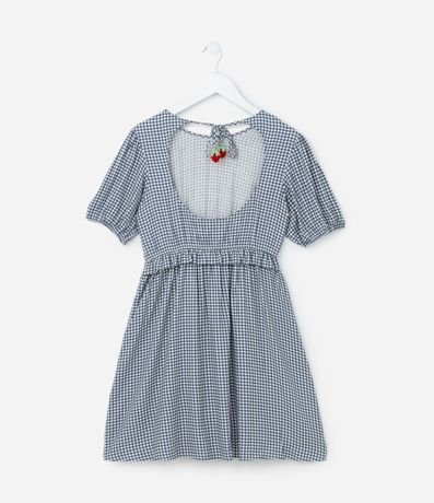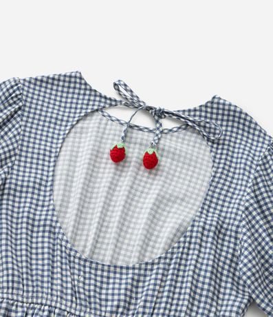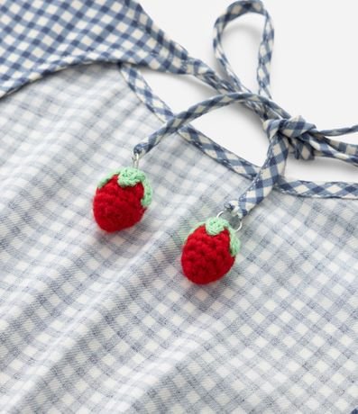 Ref: Vestidinho infantil confeccionado em viscose mais sustentável, com gola redonda, mangas curtas, babadinho na cintura e recorte nas costas com amarração por pingente de moranguinho super delicado! Possui estampa xadrez vichy.