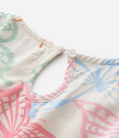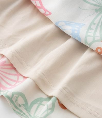 Vestido infantil confeccionado em viscose mais sustentável, com gola redonda, mangas curtas, detalhe de recorte frontal e estampa de borboletinhas.
