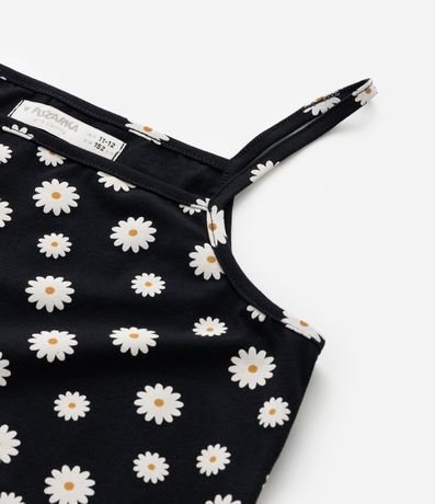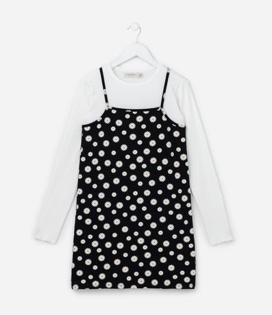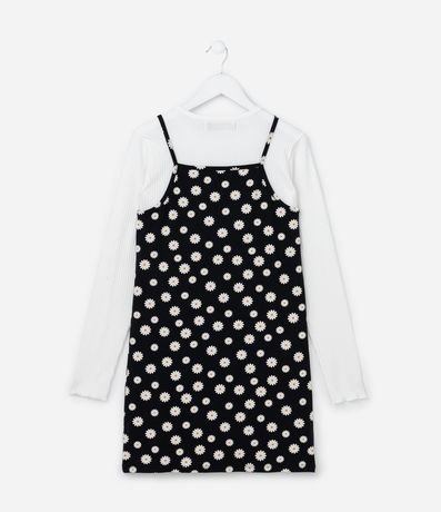 Ref: Vestido infantil com blusinha de sobreposição. Confeccionado em algodão mais sustentável, o vestido possui alças finas, estampa de margaridas e acompanha uma blusinha de manga longa com textura canelada e frufru nas bordas.