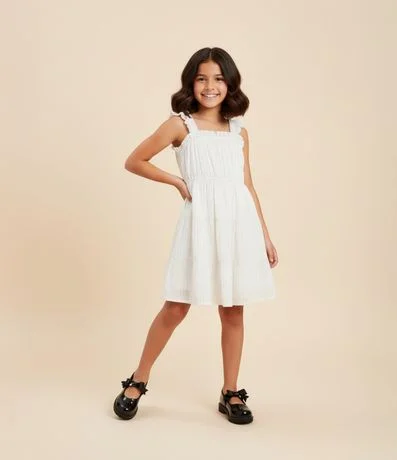 Vestido infantil confeccionado em airflow mais sustentável. Possui decote quadrado, alcinhas, com babadinhos, elástico na cintura e estampa metalizada.