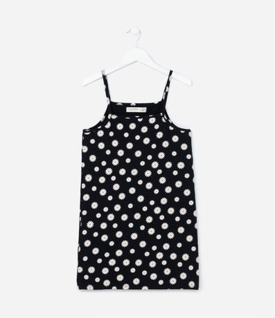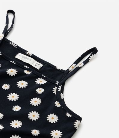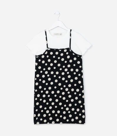 Ref: Vestido infantil com blusinha de sobreposição. Confeccionado em algodão, o vestido possui alças finas, estampa de margaridas e acompanha uma blusinha de mangas curtas com textura canelada.