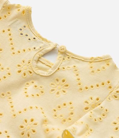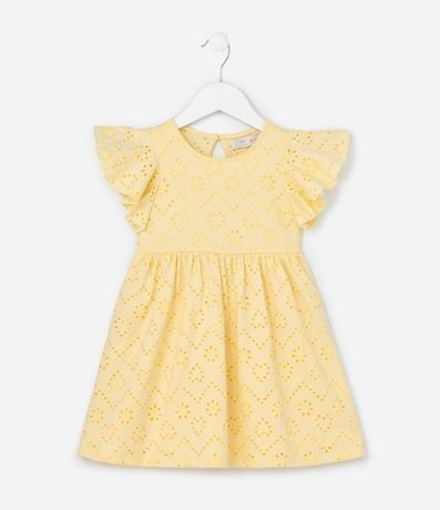 Ref: Vestido infantil confeccionado em broderie mais sustentável através de boas práticas ambientais. Possui gola redonda, detalhe em gota nas costas, manga curta, preguinhas na cintura e estampa texturizada.