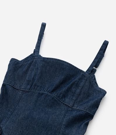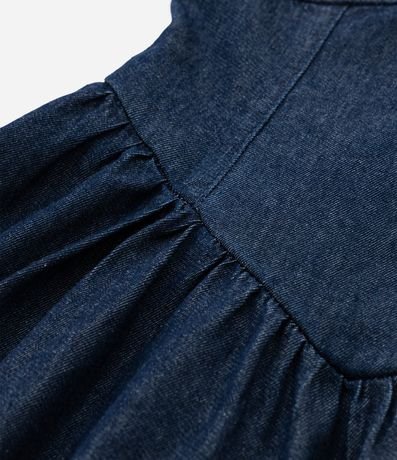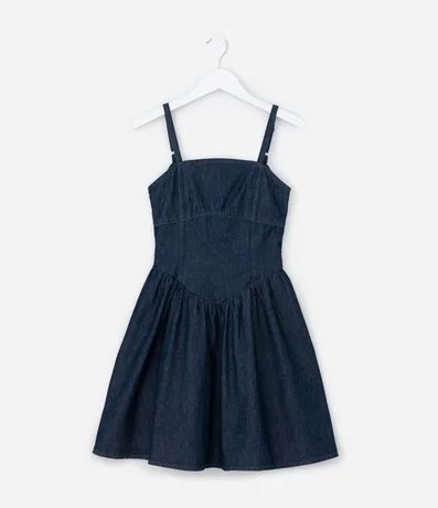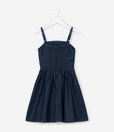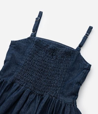 Ref: Vestido infantil confeccionado em jeans mais sustentável através de boas práticas ambientais. Possui decote quadrado, alcinhas ajustáveis, lastex nas costas e cintura em v com babadinhos.
