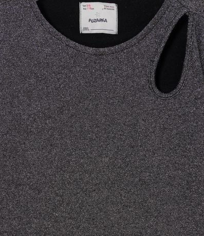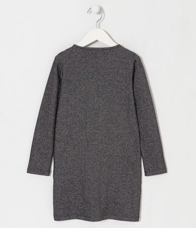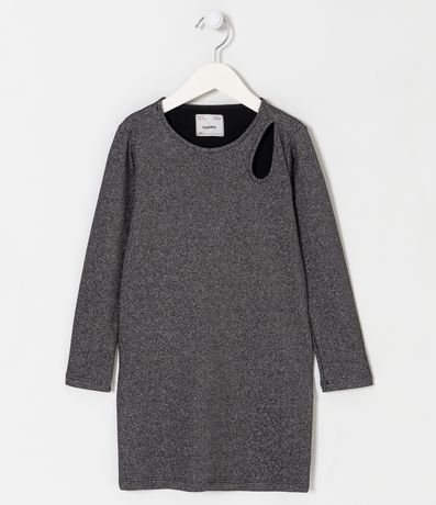 Ref: Vestido infantil, estilo tubinho, em malha brilhosa com fio metalizado, recorte vazado no ombro e mangas longas.