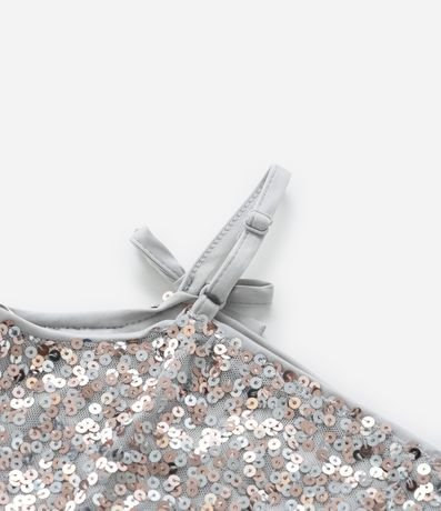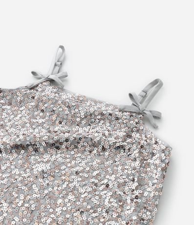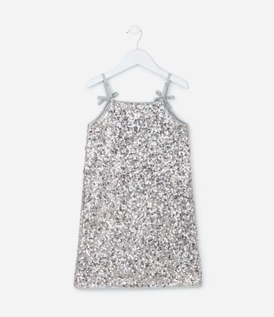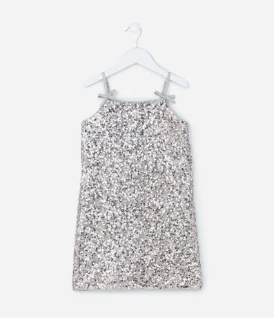 Vestido infantil confeccionado em paetê mais sustentável. Possui decote quadrado e alcinhas com lacinhos.