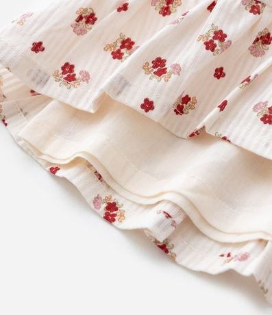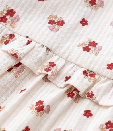 Vestido infantil confeccionado em tricoline mais sustentável. Possui decote quadrado, manga curta, babadinhos, estampa floral e acompanha calcinha.